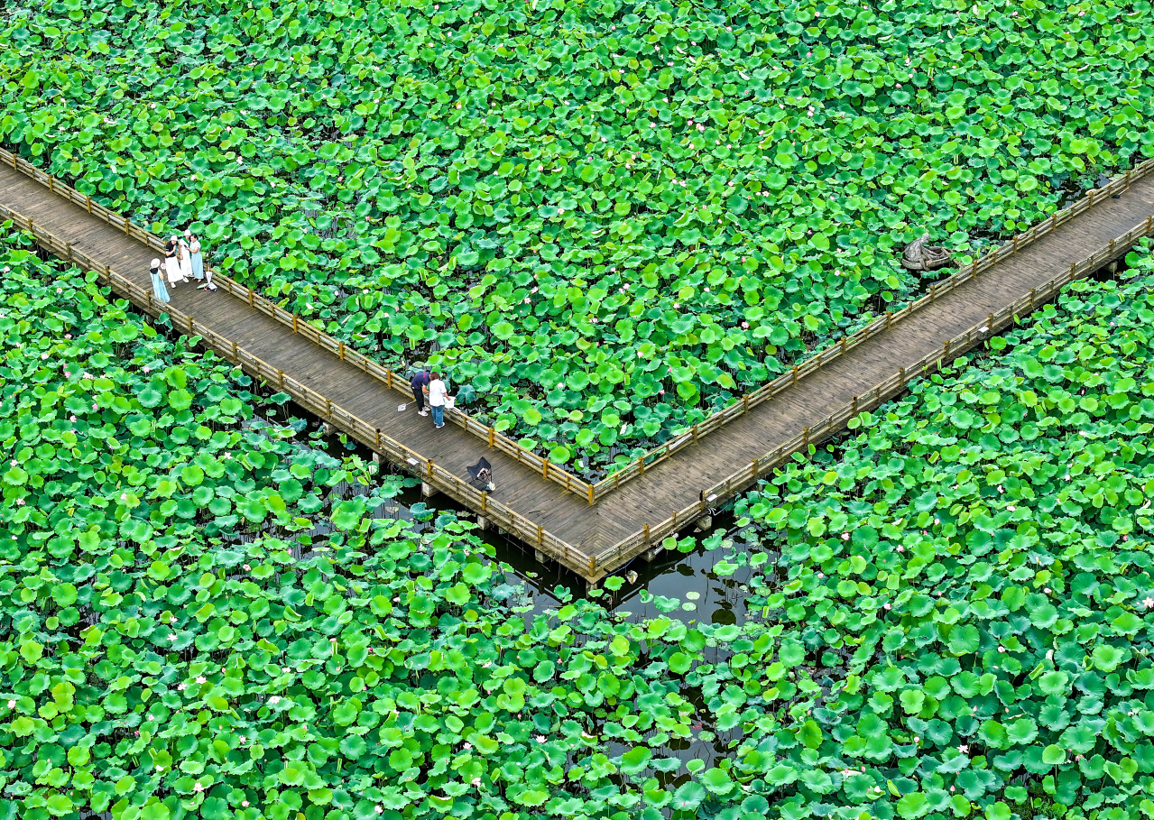 仲夏时节,四川省华蓥市明月镇白鹤咀村利用治理后的渠江滩涂种植的荷花相继绽放,吸引不少市民前来打卡游玩。