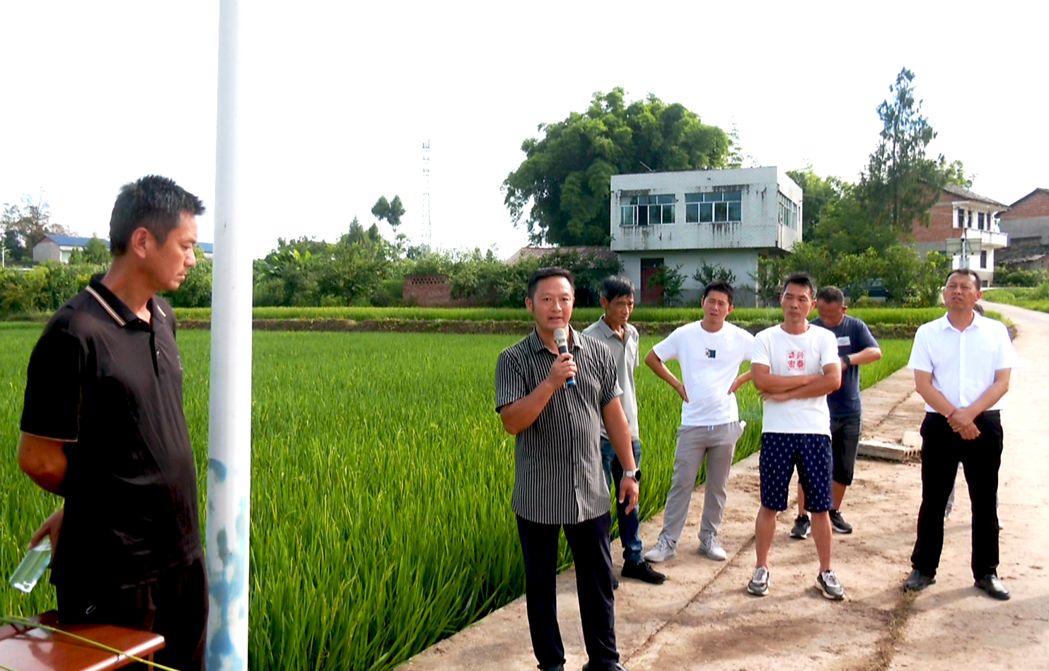 “飞防的时候一定要告诉机手,注意田边高粱、玉米以及老百姓的蔬菜等等,不要飘到他们作物上面。”目前正值水稻病虫害防治关键期,在花桥镇冲锋村水稻千亩展示片,植保专家、广安区农业技术中心植保站站长杨军正在为种植业主们讲解无人机飞防注意事项,引导参会人员实地查看水稻规模化种植成效。