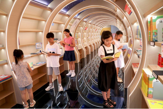 7月6日,孩子们在四川省广安市广安区广福街道望江社区思源书屋时空隧道书廊浏览图书。