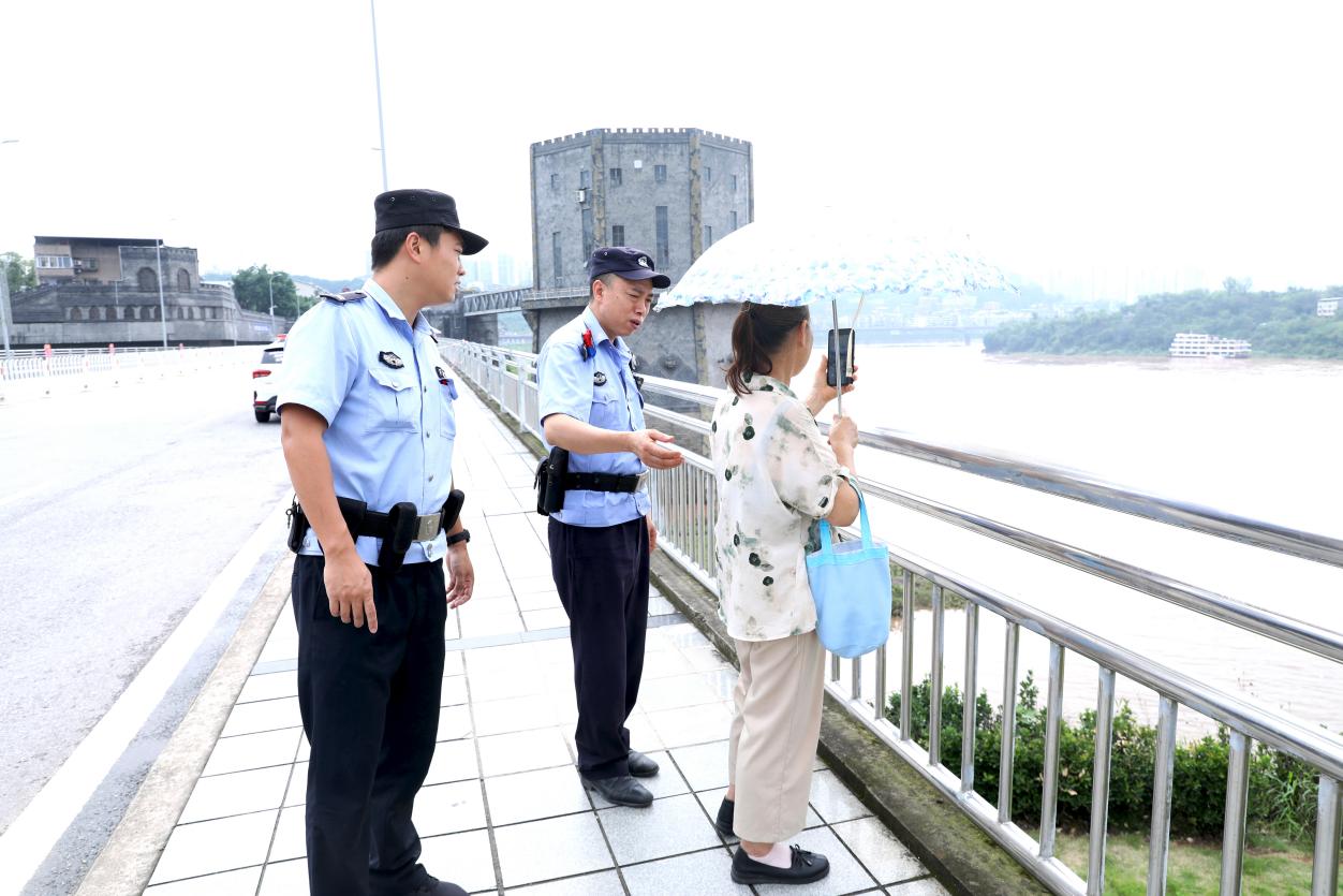 7月10日,四川省广安市广安区公安分局浓洄派出所民警在渠江西溪峡谷段洪水警戒线外劝导市民不要在渠江边逗留和拍照。