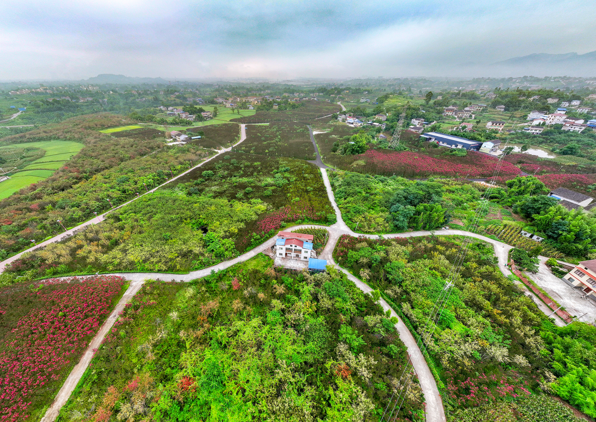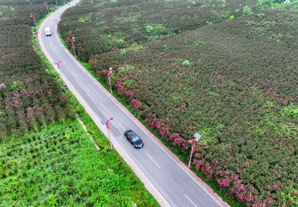 2025年7月21日,鸟瞰四川省华蓥市禄市镇凉水井村横贯在紫薇花田中的“四好农村公路”。