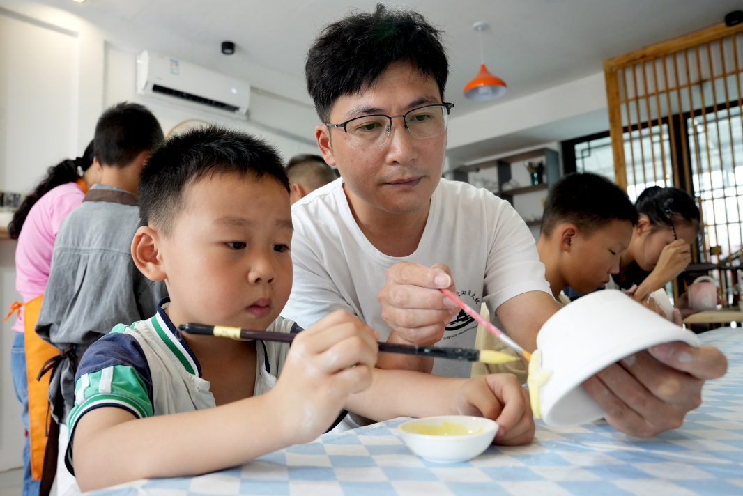 7月27日,四川省华蓥市美术家协会陶艺创作基地,一名老师指导小朋友对陶艺作品上釉。