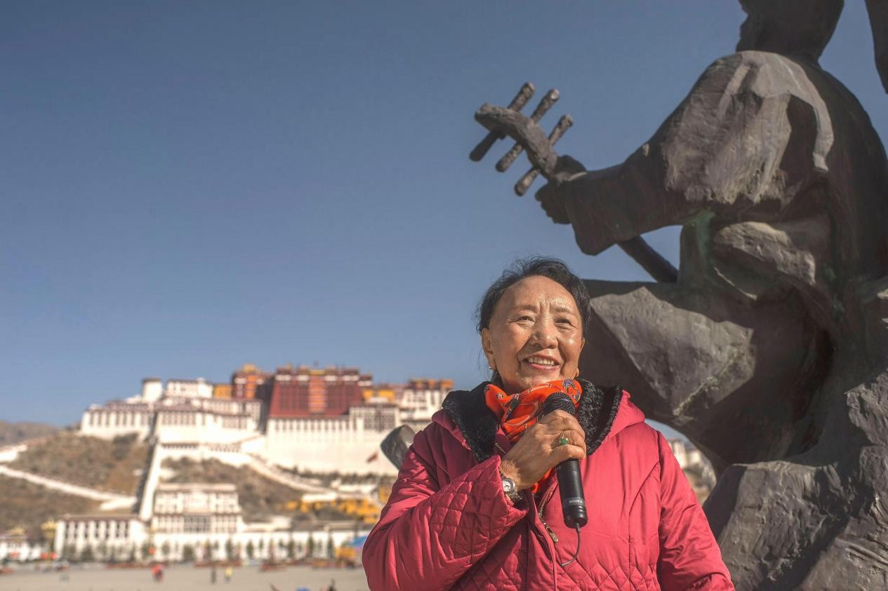觉果:才旦卓玛是我们最尊重的、最敬佩的“阿玛拉”。在拉萨,大家见到她都叫她“阿玛拉”。她是唱了一生的歌,一辈子给群众、给党唱歌。才旦卓玛是藏族人民的歌唱家,也是享誉全国的歌唱家。在布达拉宫前面拍一张环境中的肖像,因为她是一生唱歌的,所以让她拿一个话筒来拍这一张照片。正好背景雕塑也是扎念琴的一个雕塑。阿玛拉在下面拿一个话筒,背景布达拉宫就全交代好了。我拍摄才旦卓玛老师大概有20多年了,她演出的时候我拍过,她的生活我也拍过,在她家里也拍过。记录人民的艺术家,作为摄影师,我觉得应该是义不容辞的责任。
