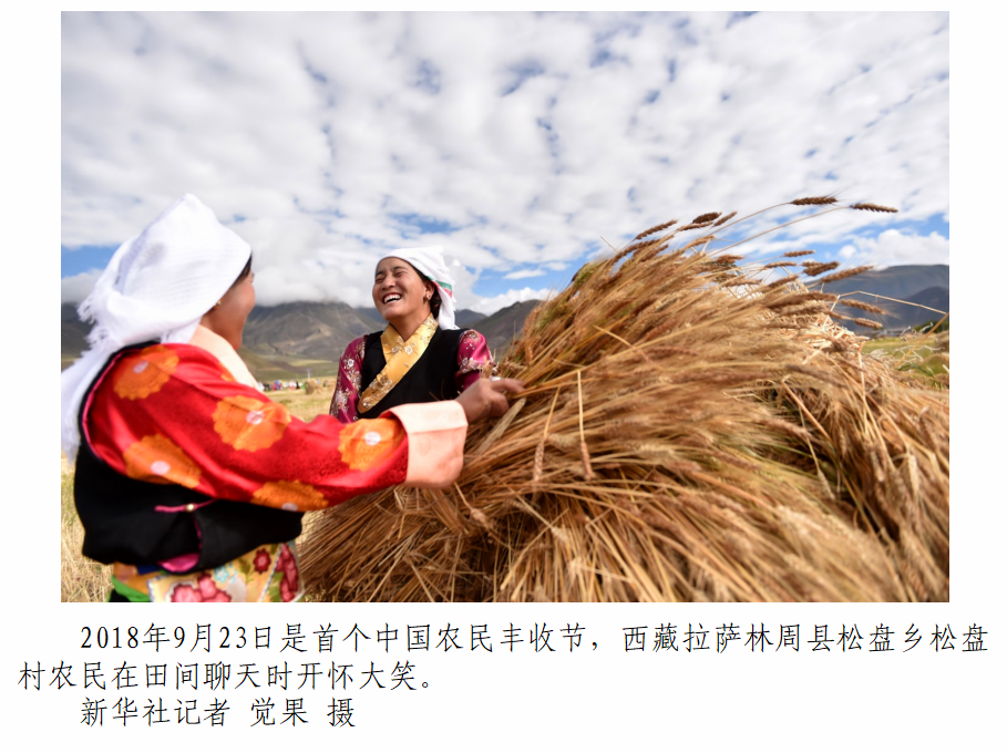 觉果:2018年,第一届中国农民丰收节,各省都在搞活动,西藏自治区的活动在西藏林周县,因为林周县是一个能种青稞、小麦的地方。当时在活动开始前,有几位藏族妇女在麦穗旁边聊天,我正好就抓拍了这一张。当时云也不错,她们的表情也不错。