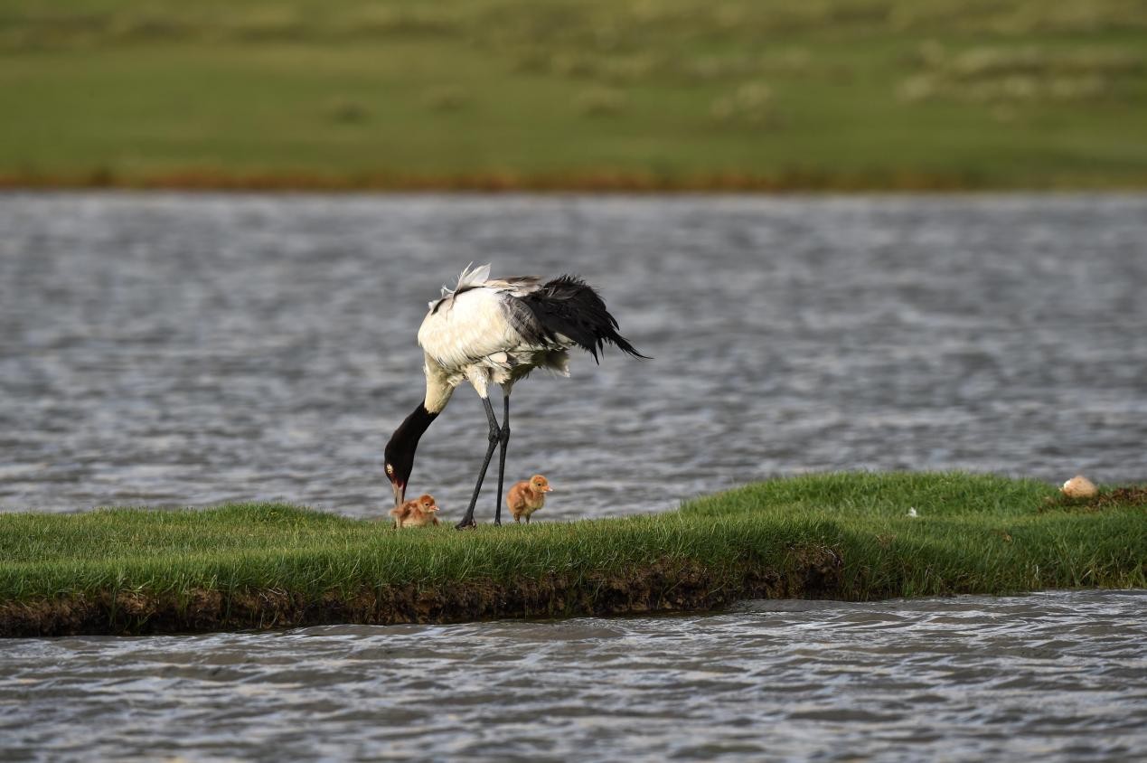 觉果:这个是在西藏申扎县高海拔地区拍的一张黑颈鹤母亲和它的两个宝宝,像以前的话,拍这种东西,那就肯定是要更大倍数的镜头。现在是人和动物互相谁也不破坏谁,谁也不干扰谁。所以现在距离很近能拍到这些东西。黑颈鹤主要生活在青藏高原,世界上鹤类很多,但能够在青藏高原上生活,黑颈鹤应该是唯一的一个鹤类。藏族人把它当成吉祥鸟。他们夏天在高海拔地区生活,避暑、产卵,冬天到拉萨河谷避寒、过冬。