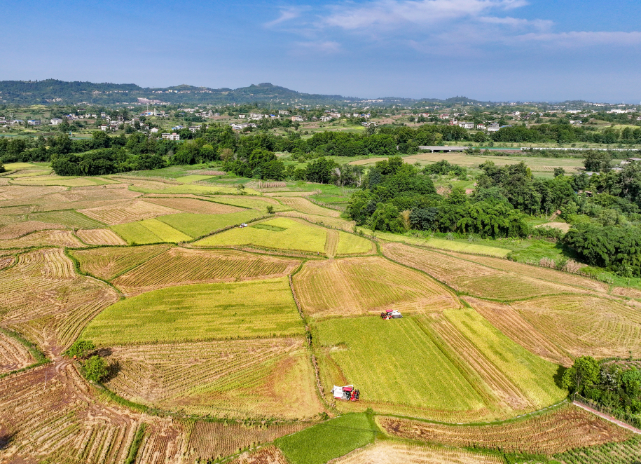 2025年8月13日,鸟瞰四川省广安市岳池县临溪镇龙摊子村连片的即将收割结束的稻田。