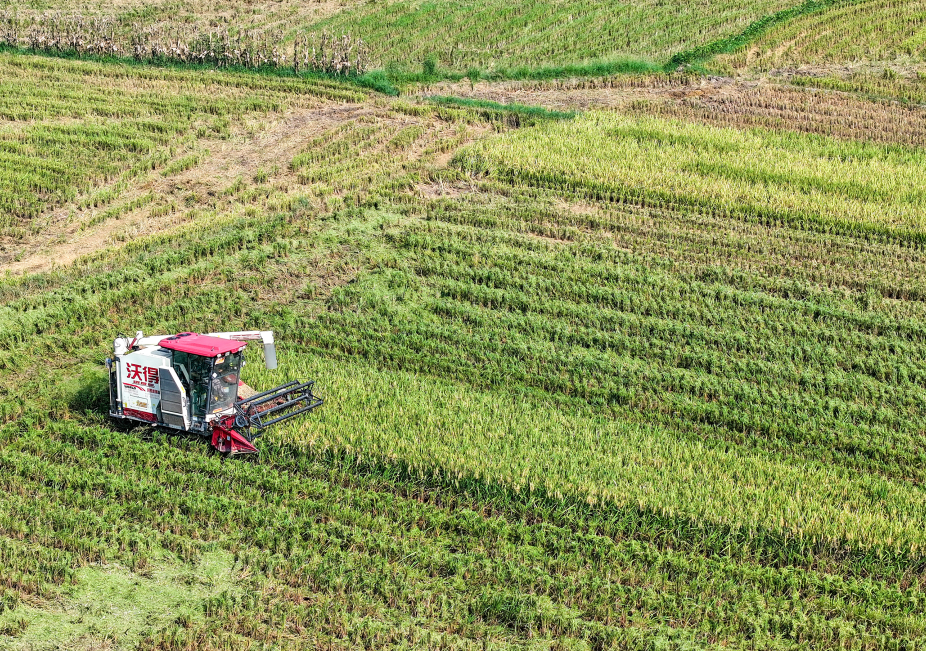 立秋之后,四川东部广安市在建“天府粮仓”中种植的近200万亩优质水稻相继成熟进入收获期,农民抢抓晴好天气奔忙田间收割,做到颗粒归仓。(邱海鹰)