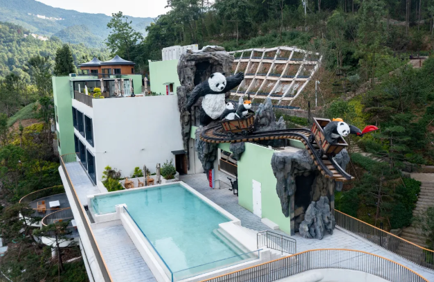 而在华蓥市红岩乡高顶村的老龙洞煤矿旧址上,一座极具工业风与自然融合特色的主题民宿——“原舍·嘿矿熊猫”民宿依山而建,展现出废弃矿区“逆生长”的魅力。
