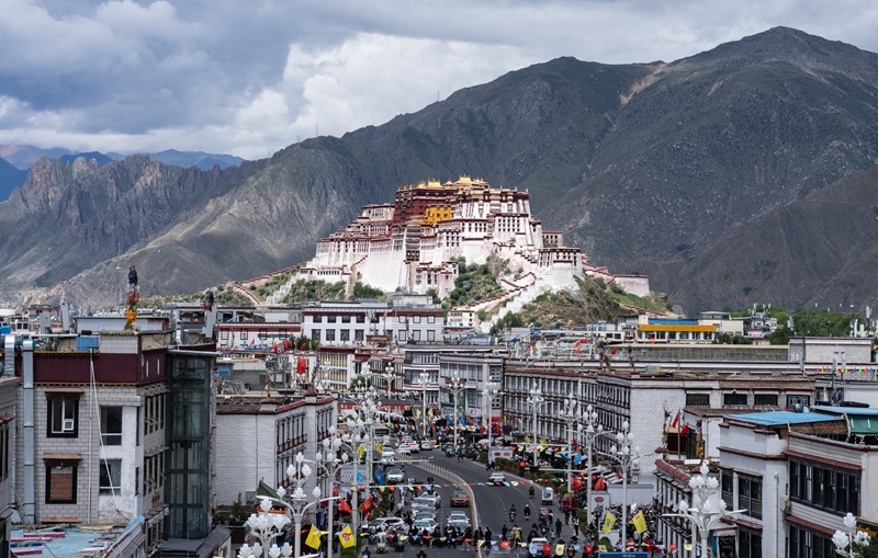 在庆祝西藏自治区成立60周年之际,拉萨街头张灯结彩,处处洋溢着喜庆氛围。