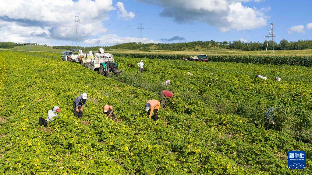 8月24日,在内蒙古呼伦贝尔市莫力达瓦达斡尔族自治旗尼尔基镇乌尔科村,村民在田里采摘黄菇娘果(无人机照片)。