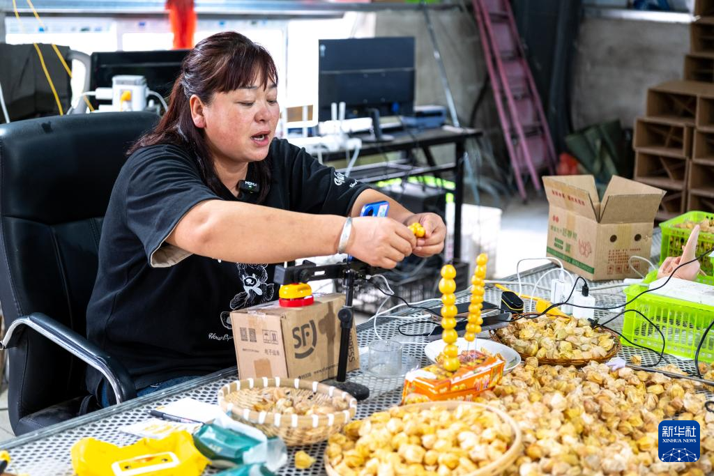 8月24日,在内蒙古呼伦贝尔市莫力达瓦达斡尔族自治旗尼尔基镇乌尔科村,村民在直播间里直播销售黄菇娘果。