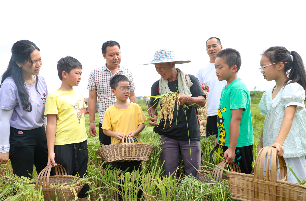 2025年9月7日,四川省华蓥市华龙街道东方村的农民在给蓥城社区参加亲子研学的孩子及其父母,介绍水稻种植等农耕文化。