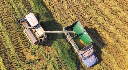 两台收割机开足马力,收稻、脱粒、秸秆粉碎等流程一气呵成。短短几分钟,一垄垄水稻便化为金灿灿的谷粒存入机身粮仓,随后被转运至合作社加工坊进行烘干处理。