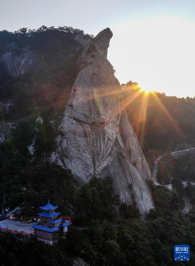 秋日清晨,初升的太阳照在湖北省麻城市龟峰山景区的奇峰怪石上,勾勒出“龟峰旭日”的壮丽景象。