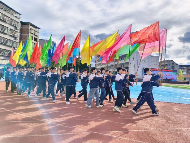 上午9时,《运动员进行曲》的激昂旋律响彻校园,开幕式入场仪式正式开启。国旗队昂首阔步,五星红旗迎风飘扬,彰显着爱国主义教育的深厚底色;校旗队紧随其后,承载着石永中学数十年办学的初心与使命;会标队手持印有“团结”“跨越”的标识,将“以体育凝聚力量,以运动超越自我”的理念传递至每一位师生心中。随后,口号方队高举“鸣奏青春旋律,抒写运动乐章”的标语,展现出新时代青少年对健康成长的追求;彩旗方队的五彩旗帜迎风舞动,为赛场注入蓬勃生机,也勾勒出学校五育并举的生动图景。