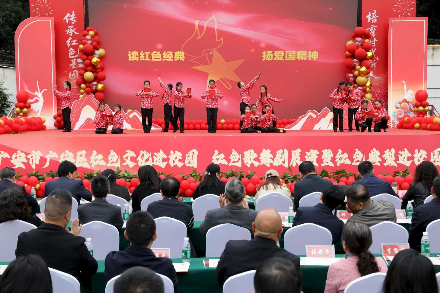 10月30日,四川省广安市广安区“传承红色基因•培育时代新人”红色文化进校园红色歌舞剧展演暨红色典型进校园活动在富源小学举行,来自东方小学、富源小学、厚街小学、广安小学、中国石油广安希望学校、广安希贤学校、兴平镇小学等7所红色教育基地学校的学生表演了红色歌舞剧,用青春的歌声,唱响对革命先辈的无限崇敬;用动人的舞姿,描绘那段峥嵘岁月的光辉历程;用栩栩如生的情景剧,重温红色记忆汲取奋进力量展示代代相传的使命与担当。展演活动在合唱《我和我的祖国》中结束。