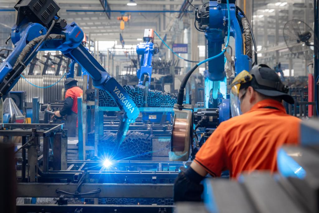 10月16日,在江苏省徐州市丰县电动车生产企业车间内,工人在焊接电动三轮车配件。新华社记者 毛俊 摄