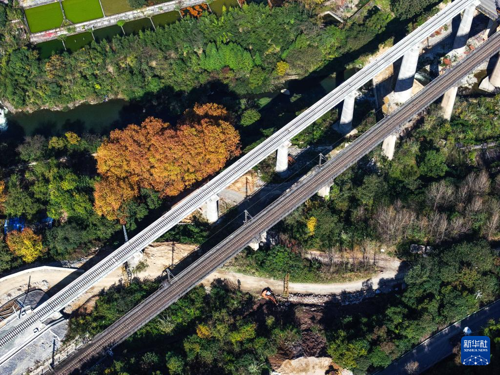 这是11月16日拍摄的贵州瓮马铁路南延伸线(左)架梁铺轨完成的绿荫湖1号桥(无人机照片)。