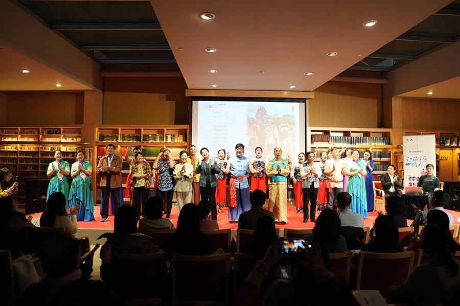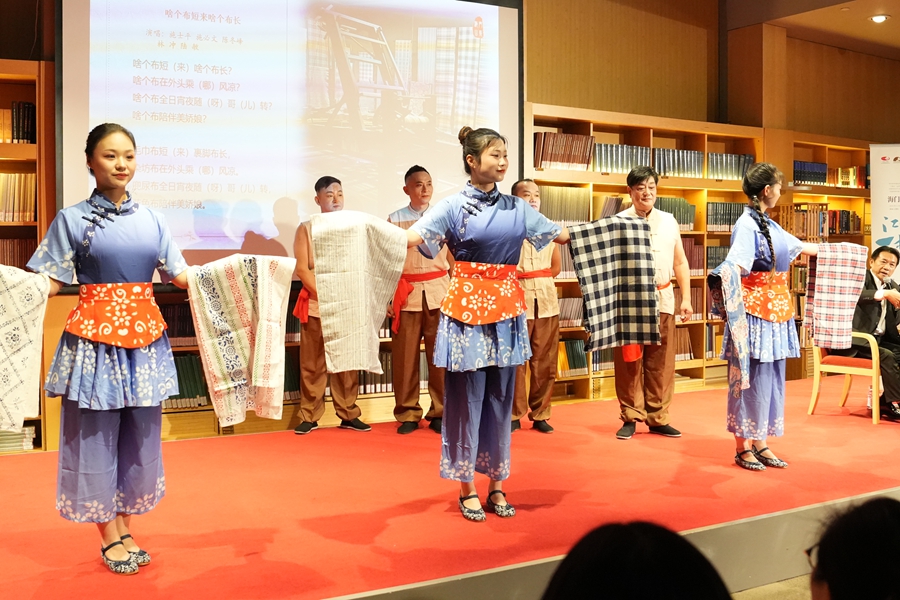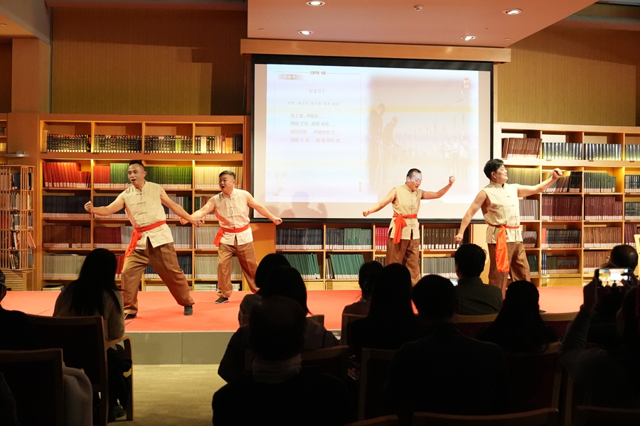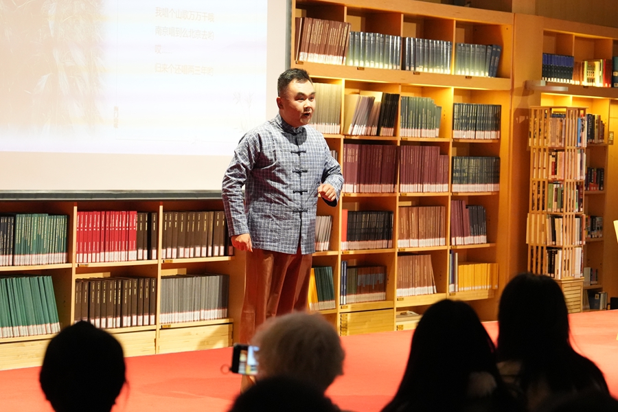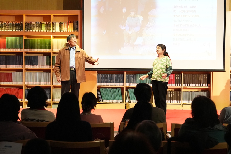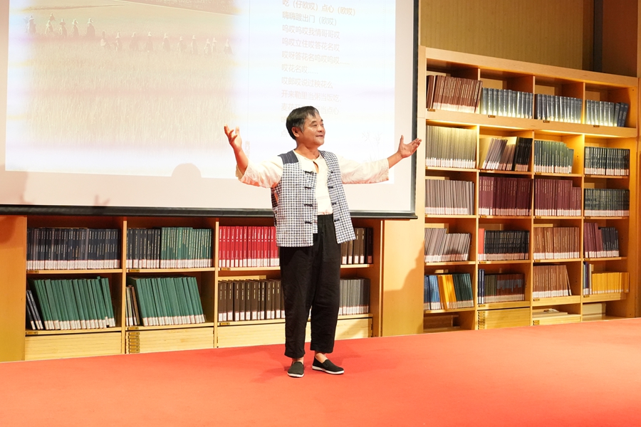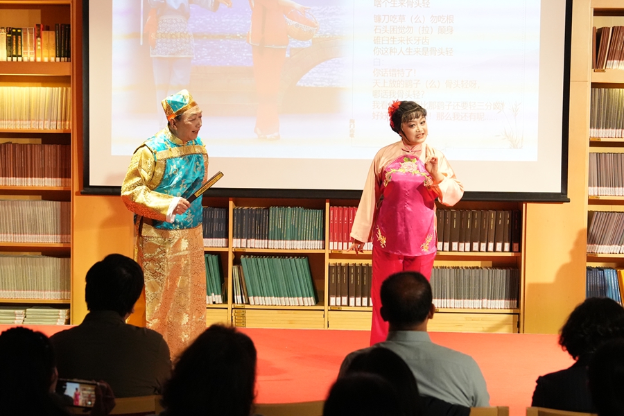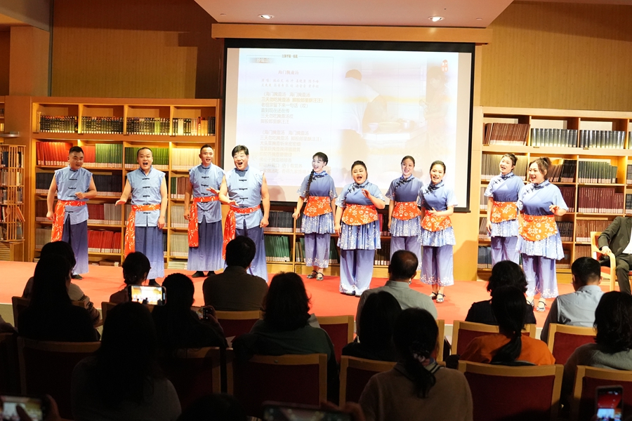 讲唱会特邀的“南通市文艺家宋卫香工作室”成员由南通市(海门区)内外各行各业的海门山歌非遗传承人、民歌爱好者组成。作为数百年以来多地移民历史和不同习俗文化融合发展的一种记录和再现,主唱团队以海门一带民间“对花调”为基础,结合本次活动主题即兴填词并与现场观众互动了山歌《我把山歌捧出来》,那热情洋溢、妙语连珠的歌声,引得现场观众报以热烈掌声。