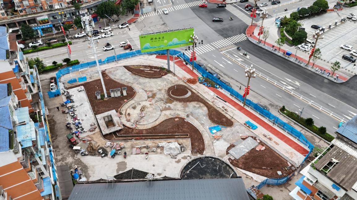 位于挞子丘农贸市场云峰路段的怡园口袋公园项目,是“见缝插绿”的又一典型。占地约1650平方米的怡园内,一棵郁郁葱葱的大黄桷树巍然屹立,成为整个空间的视觉焦点。围绕古树,工人们正加紧路面硬化施工:文化长廊的廊架屋面结构已初见雏形,艺术铺装与生态雨水花园相映成趣,管线铺设也在同步推进。