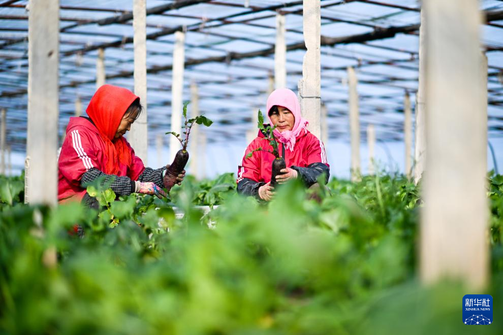 11月20日,在天津市西青区辛口镇种植沙窝萝卜的大棚内,农民在采摘萝卜。