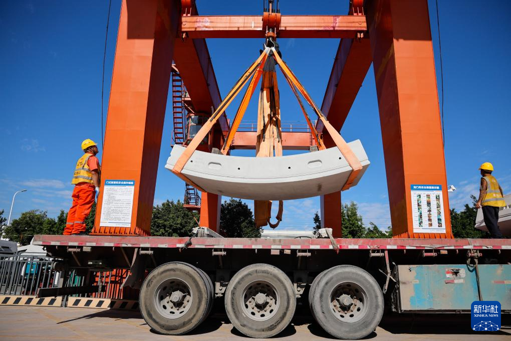 11月23日,施工人员在广南联络线西塱隧道物资场吊运隧道管片。