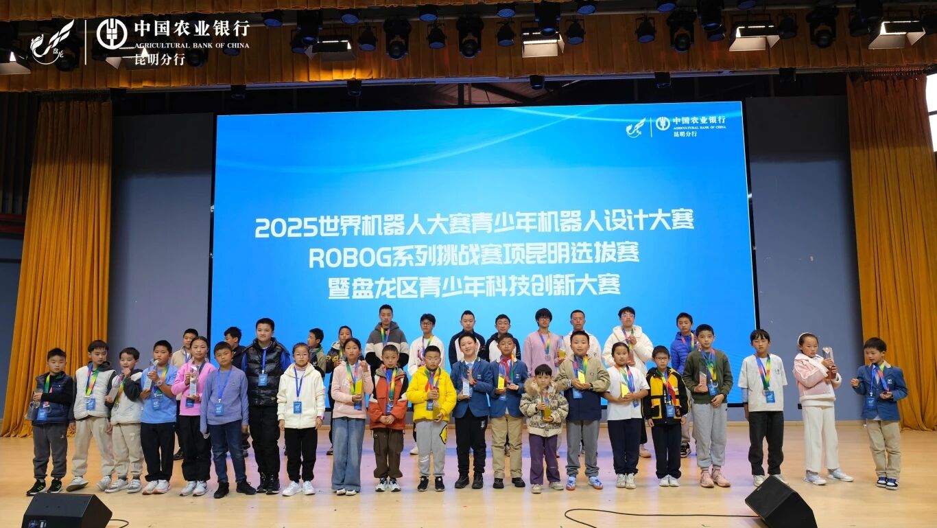 11月23日下午,2025世界机器人大赛青少年机器人设计大赛ROBOG系列挑战赛项昆明城市赛暨盘龙区青少年科技创新大赛在东北师范大学盘龙实验学校顺利落下帷幕。本次大赛吸引了近千名中小学学生踊跃参与,历经两天的激烈角逐,一批青少年选手在ROBOG、MakeX、人工智能等多个赛项中脱颖而出,展现出昆明青少年扎实的科技素养与卓越的创新能力。
