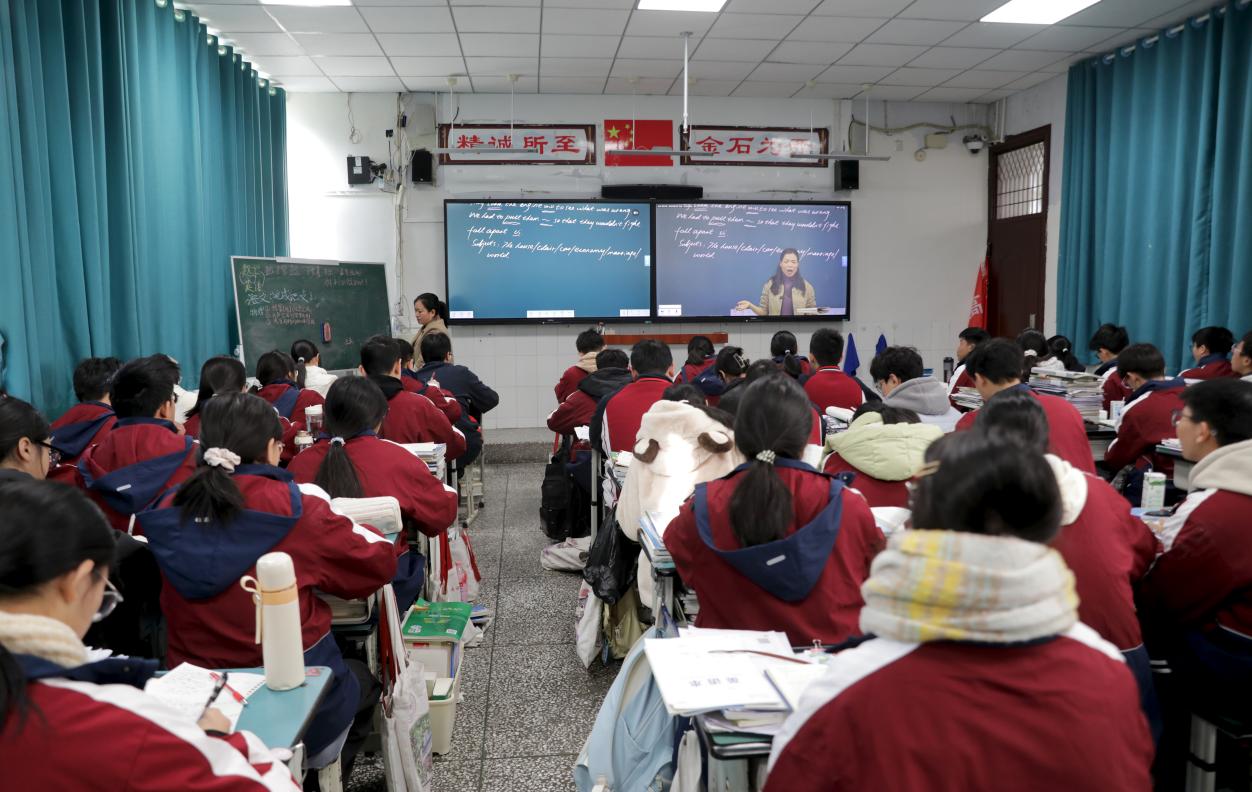11月26日上午10时许,在四川省广安中学高一2班(南开班),学生正通过视频系统聆听重庆南开中学老师的英语直播课,不时地在本子上做着笔记。“我们高中共有两个南开班,学生上课期间均是通过视频系统聆听重庆南开中学老师的直播课,预习引导、课堂管理、复习巩固由广安中学老师负责。学生刚开始还有点不适应,现在经过两个多月实践,大多数已经习惯了。”该班英语辅导教师胡婷婷介绍,“已经进行了三次测试,最近一次班上一名同学的总分名列全校第一名,效果不错。”