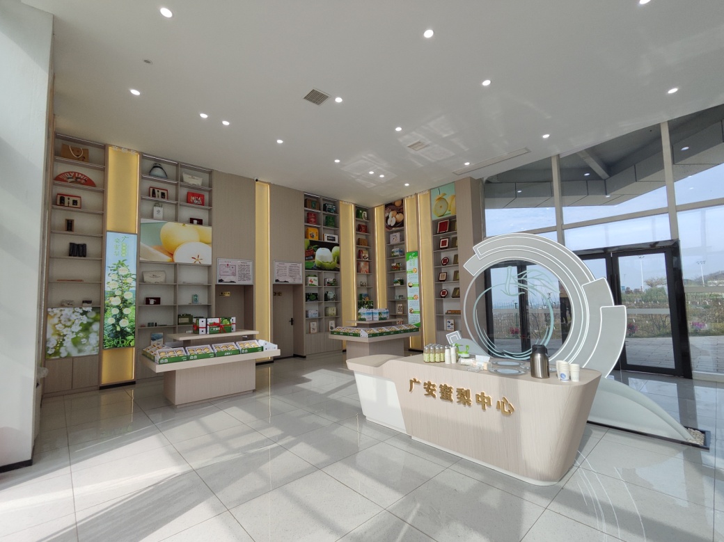 广安蜜梨园区展示中心分为两层,一层展示了蜜梨在中国传统饮食文化中的重要地位;二层以广安蜜梨产业为核心,介绍了产业背景和发展情况,并融入农业研学、电商直播、展示展销、果品检测等多项功能。