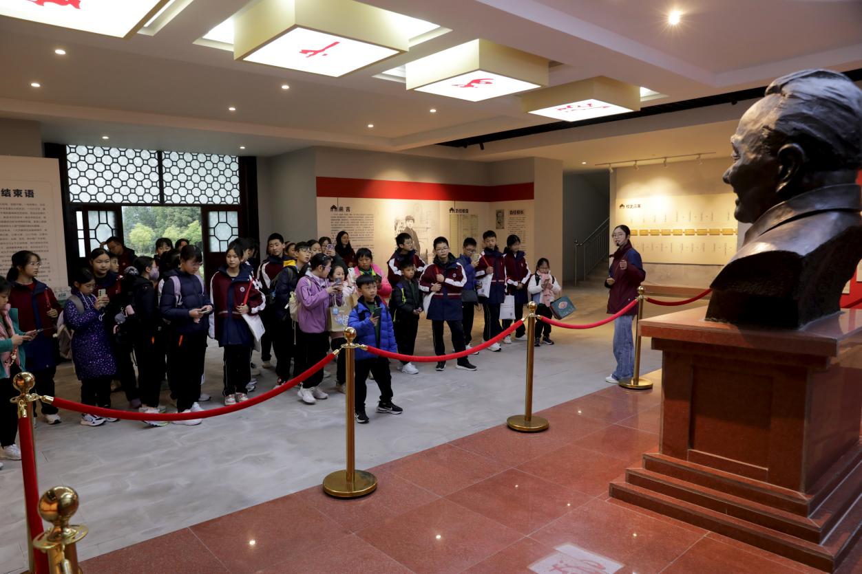 12月4日,在四川省广安中学校史馆,来自香港优才书院的学生与广安中学的学生在一起参观邓小平塑像。