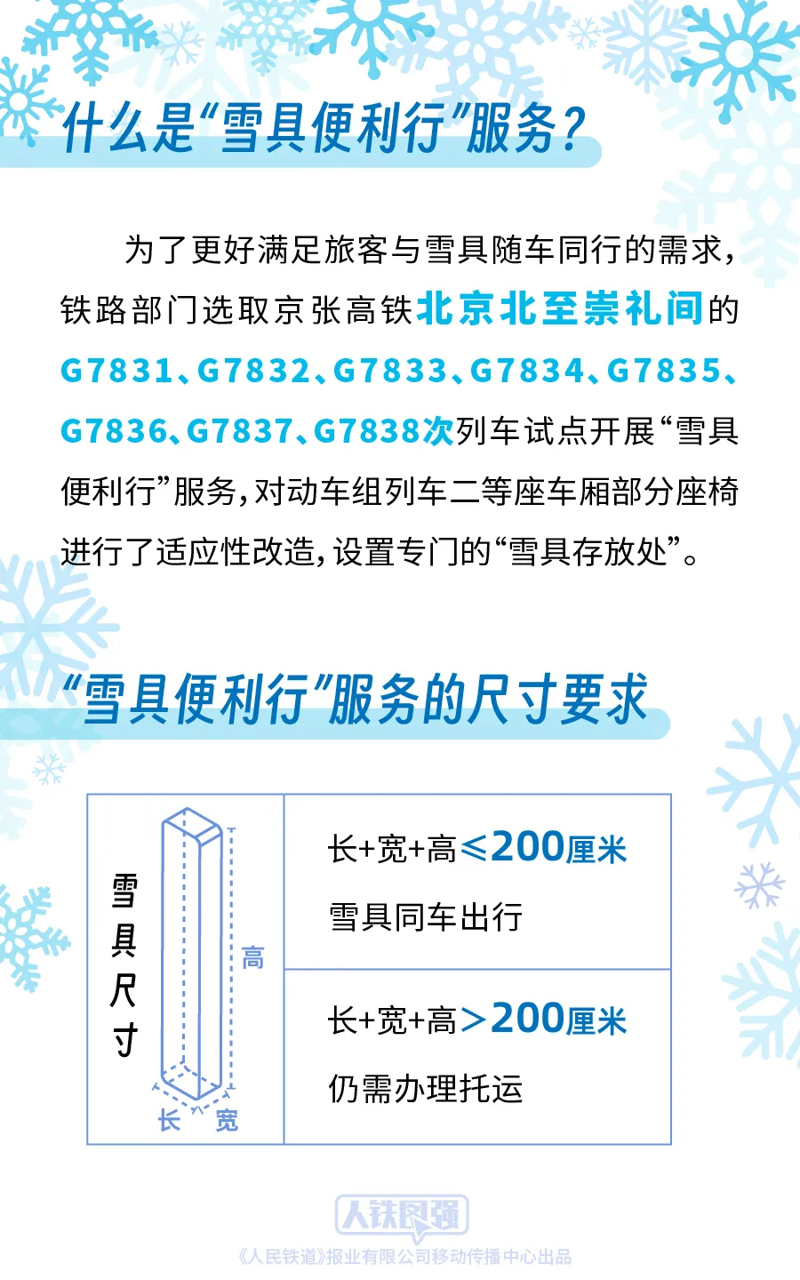 铁路部门坚持以人民为中心的发展思想,持续深化运输供给侧结构性改革,积极适应旅客多样化的出行需求,为携带雪具出行的旅客提供便捷服务。前期,铁路部门按照《国铁集团铁路旅客运输规程》“旅客乘坐动车组列车随身携带的行李物品长、宽、高之和不超过130厘米”的规定,对超过上述尺寸标准的雪具推出了“雪具快运”服务。为了更好满足旅客与雪具随车同行的需求,铁路部门统筹考虑旅客安全、乘车秩序和雪具运输需求,选取京张高铁北京北至崇礼间的G7831、G7832、G7833、G7834、G7835、G7836、G7837、G7838次列车试点开展“雪具便利行”服务,对动车组列车二等座车厢部分座椅进行了适应性改造,设置专门的“雪具存放处”,旅客选择该服务后可携带长、宽、高之和不超过200厘米的雪具同车出行,滑雪更加方便快捷。对于长、宽、高之和超过200厘米的雪具,由于高铁列车车内空间限制,仍需办理托运。