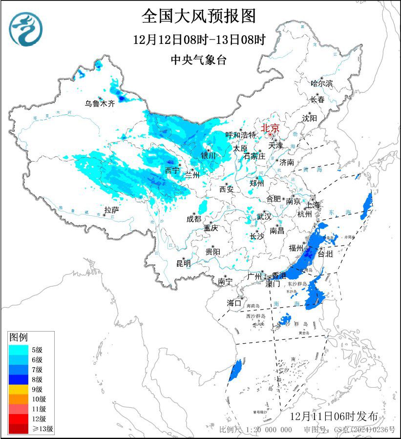 预计,12月11日08时至12日08时,新疆北疆东部和南疆盆地、西北地区中东部、内蒙古西部、华北西部、山东半岛、西藏中北部等地部分地区有5~7级、阵风8~9级的大风,其中,新疆山口地区阵风可达10~11级;渤海、渤海海峡、黄海大部海域、东海大部海域、台湾海峡、南海东北部和中东部海域将有7级、阵风8~9级的大风,其中渤海、黄海北部海域、台湾海峡部分海域风力可达8级、阵风9~10级。