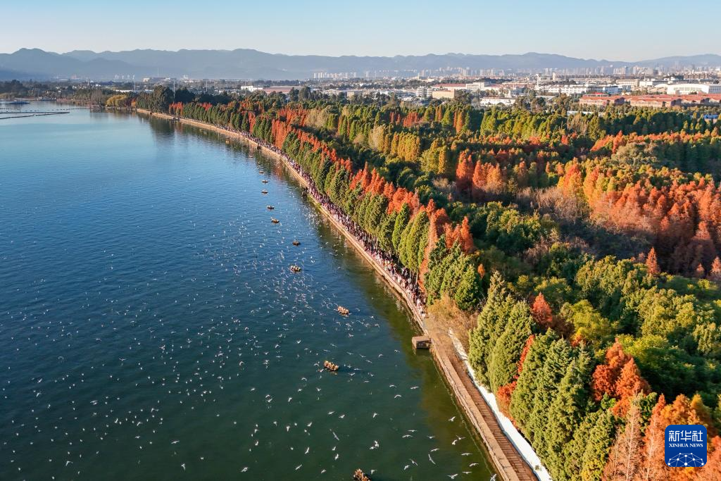 12月10日在滇池畔拍摄的海洪湿地公园一景(无人机照片)。