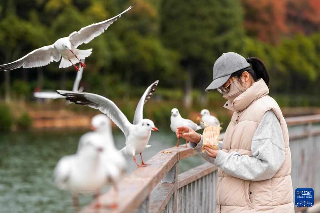 12月11日,游客在滇池畔的星海半岛生态湿地喂红嘴鸥。