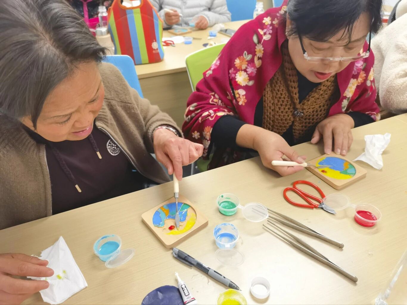 “手手相传”的实践环节,老师细致讲解工具使用,并演示“掐丝”与“点蓝”两大核心技法。居民们在“吉祥纹样”底稿上,亲手弯折金丝、填充彩砂,体验从无到有的创造过程。现场气氛专注而宁静,不同年龄的参与者沉浸其中——青年一代被传统工艺的精妙所吸引,年长者则在慢工细活中重拾手作的温度。这一过程不仅是技艺的学习,更是非遗生命力的亲身传递。