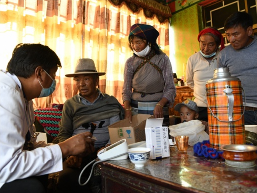A doctor performs a home visit. Photo by Gonggar Lesong