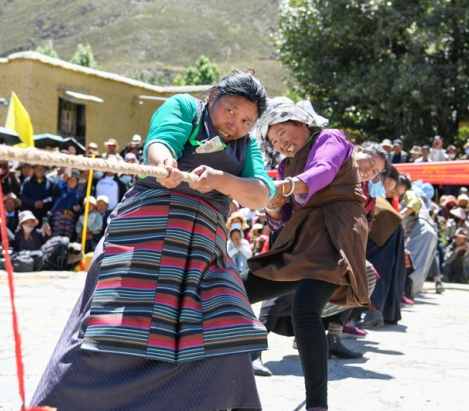 Women during a tug-of-war contest. Photo by Gonggar Lesong