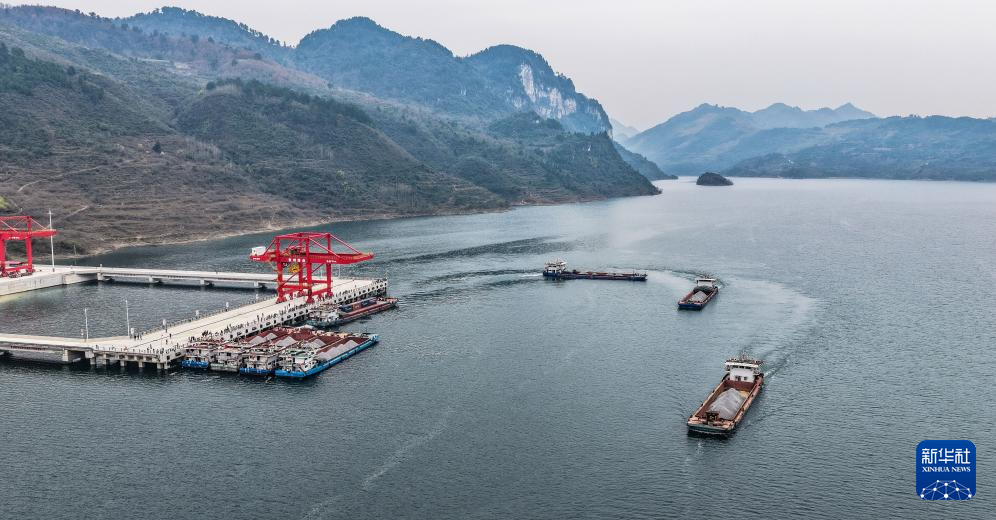 12月16日,货船从瓮安港云中港区启运出发(无人机照片)。