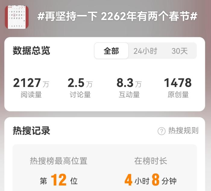 中新网北京12月24日电(记者 上官云)“再坚持一下,2262年有两个春节!”前不久,当这个消息被刷上热搜后,很快在社交平台上掀起一场热议,有人调侃:能不能放两次假?