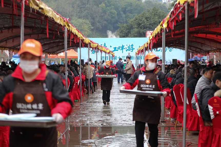 上午10点58分,沿口古镇主会场百桌庖汤宴整齐排开,热气蒸腾的肉香裹挟着花椒、八角的辛香弥漫街巷。随着开席号角响起,糖熬肉、大刀烧白等武胜特色菜品陆续上桌;舞台上,歌伴舞《春风十万里》让庖汤的温暖吹进每一位武胜人的心中;川剧戏歌《说古道今唱广安》再现历史悠久、人文荟萃、生态优美的历史文化名城。大家一边欣赏着文艺表演,一边品尝着满席美食,碗筷交错间流淌出浓浓的乡情与节日的喜庆,欢声笑语回荡在古镇上空。
