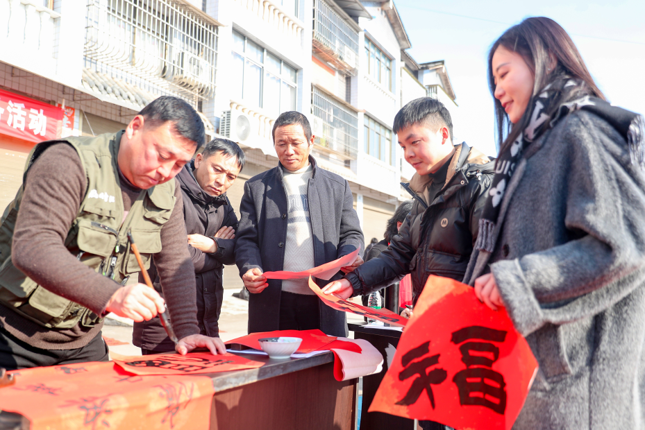 1月6日,由四川省广安市文联组织书法家协会开展的“强基工程·红色联姻”— 2026年“迎春送福进万家”志愿服务活动,在华蓥市永兴镇马架坪村启动。书法志愿者冒着严寒,为当地群众义务书写春联和“福”、“春”字等门贴,及早拉开迎新春送温暖帷幕。(邱海鹰)