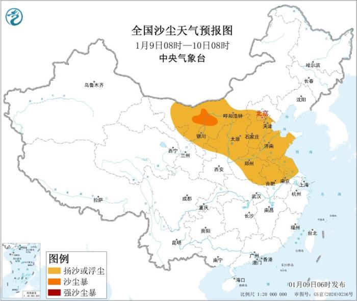 预计,1月9日8时至10日8时,内蒙古中西部、西北地区东北部、华北、山东半岛、辽东半岛等地有5~6级西北风,其中,内蒙古西部、山西北部等地部分地区有7级风,阵风8~9级,华北西部和北部局地高海拔地区阵风可达10级以上;渤海、渤海海峡、黄海大部海域、台湾海峡、巴士海峡、南海东部及西南部海域将有7~8级、阵风9级的大风,其中渤海西部部分海域风力可达9级、阵风10级。