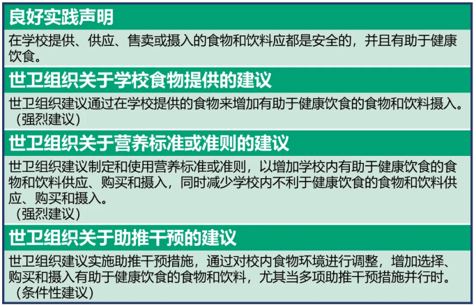 在新指南中,世卫组织建议学校改善食物供给,促进摄入有助于健康饮食的食物和饮料。具体包括: