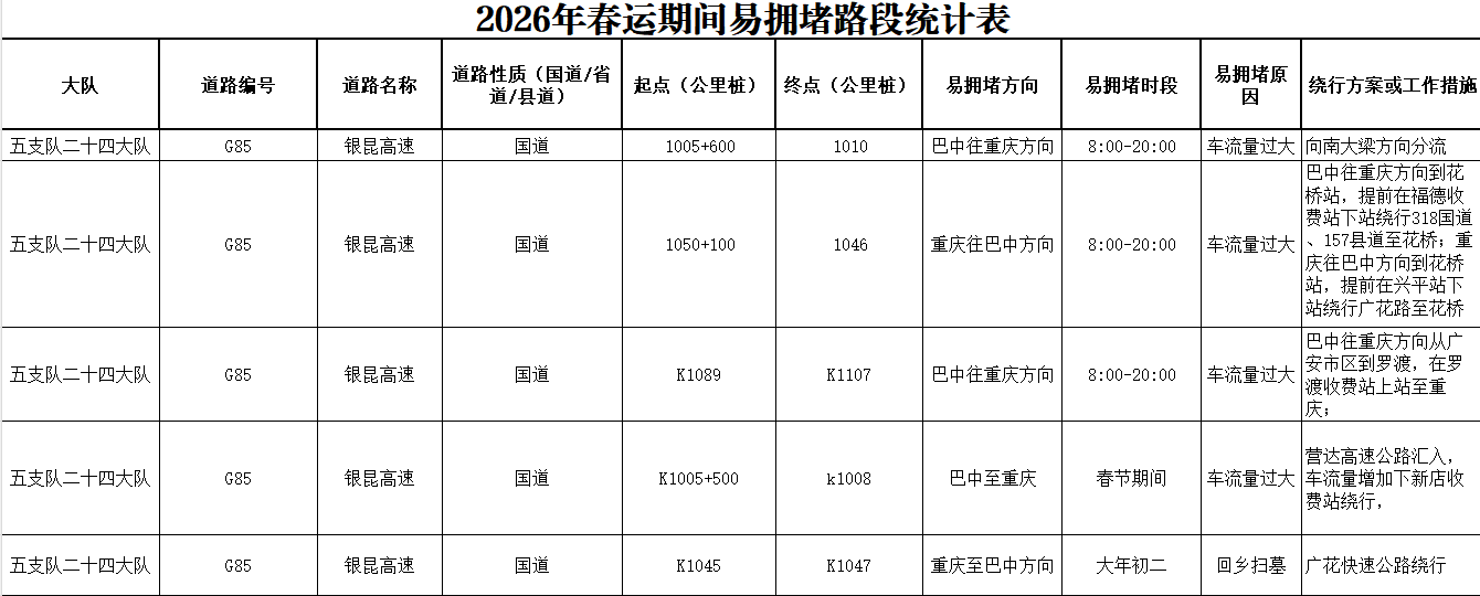 四川高速公安五分局二十四大队温馨提示:春运期间道路车流密集,请驾驶员出行前借助导航了解实时路况。如遇路段拥堵,可选择国道或周边地方道路绕行。行车途中,请严格遵守交通法规,保持安全距离,不疲劳驾驶、不超员行车,非紧急情况请勿占用应急车道。如需报警或求助,可拨打96122或12122。