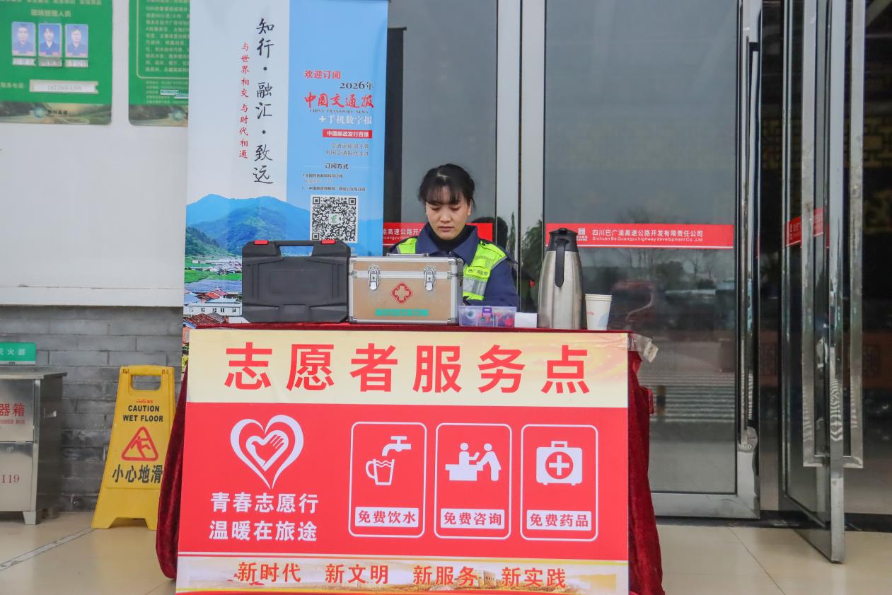 在广安服务区内,“社会治理办公室”和“警务室”标牌格外醒目。这里汇聚了高速公安、交通执法、服务区管理等多方力量,具备治安事件与交通事故快处能力,可同步提供应急物资保障。同时沿线服务区和收费站均设有志愿服务点,为过往驾乘人员提供热水、常用药品及路况咨询等服务。