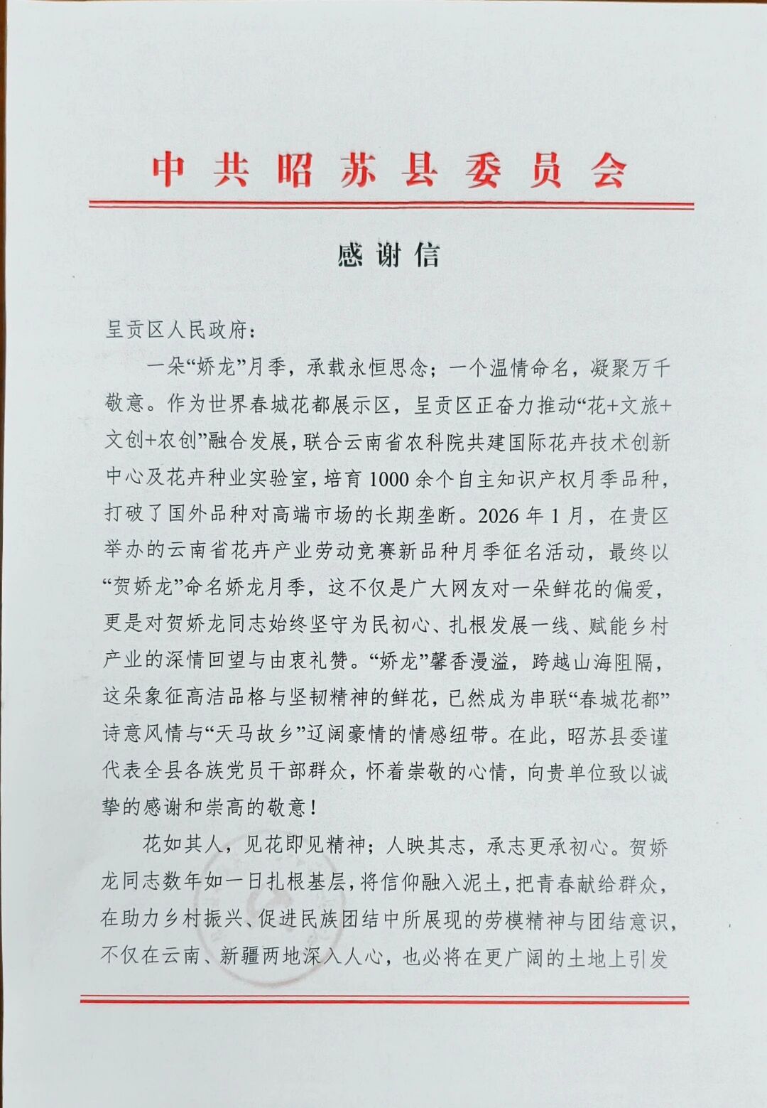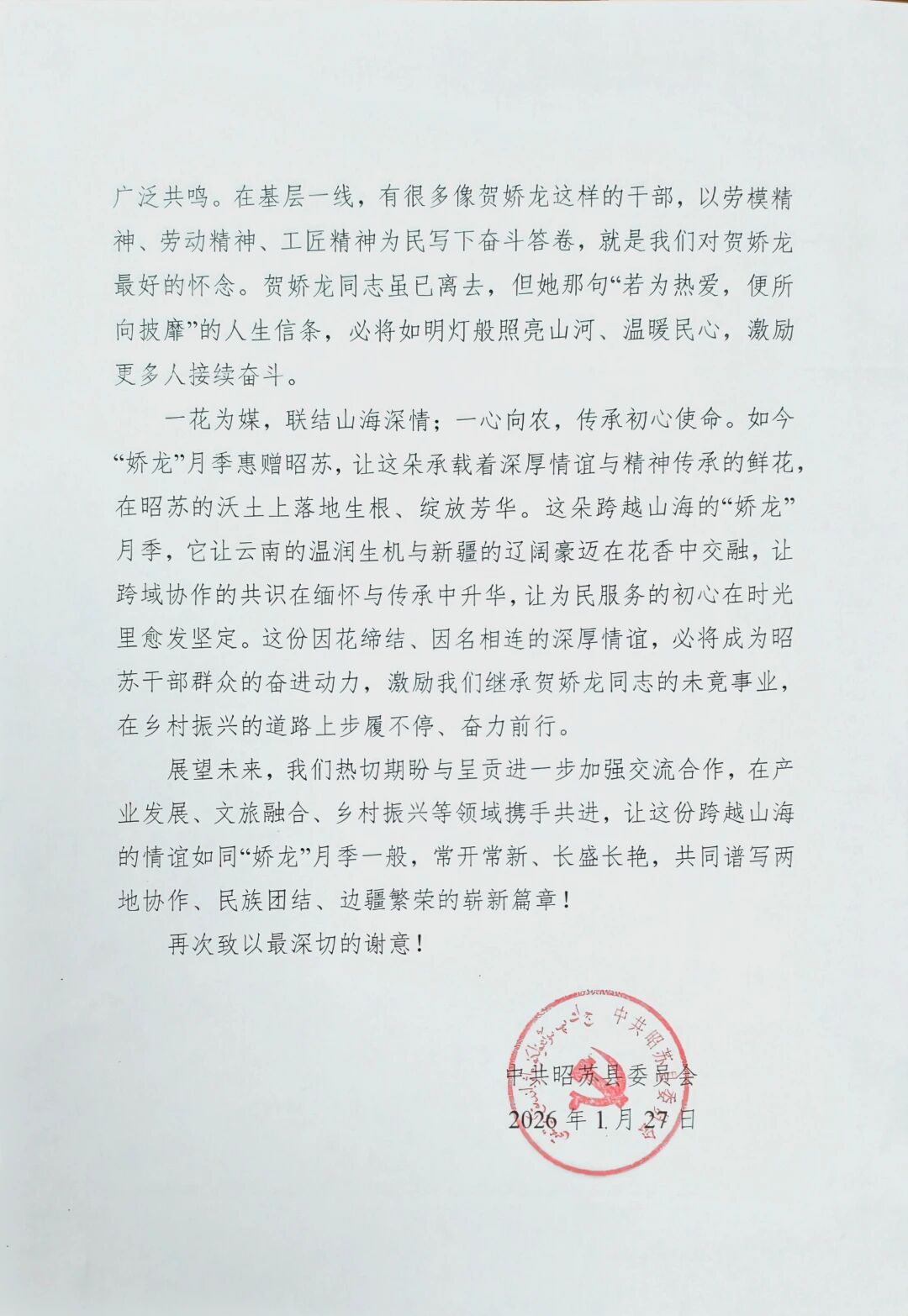 信里写:“这朵跨越山海的‘娇龙’月季,让云南的温润生机与新疆的辽阔豪迈在花香中交融。”