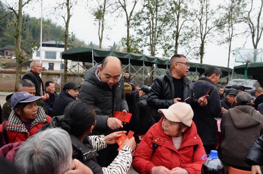 捐赠现场,爱心团队为村里18位90岁以上高龄老人、2名孤儿、5名残疾儿童及19名低保儿童送上拜年红包。一份份真挚的关怀,让受助群众脸上绽放出幸福的笑容。活动现场还宰杀土猪,请专业厨师精心准备了刨汤宴,邀请180余名老乡欢聚一堂,提前团年、共话乡情、共迎新春,让大家度过了一个难忘的节日。