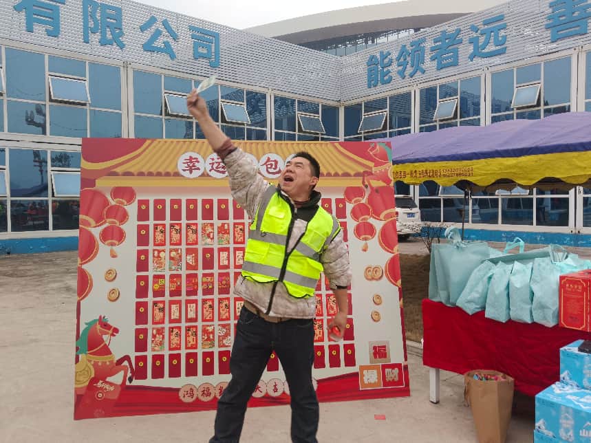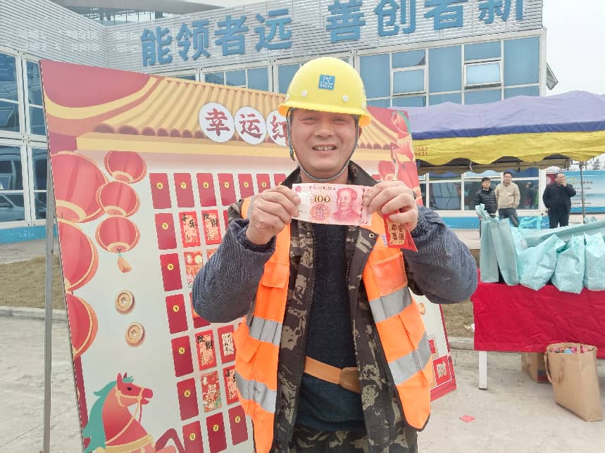 为了让这份团圆更有趣,现场还穿插了热火朝天的“安全知识抢答赛”。工友们结合日常工作中的安全规范争相抢答,答对者欢喜地从红包墙上摘下红包。随后的抽奖环节,保暖用品、实用工具套装等贴心奖品陆续送到工友手中,实现了真正的“人人有奖,满载而归”。
