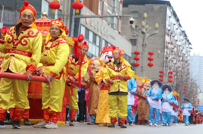 队伍中最吸睛的莫过于“非遗方阵”。代市花轿华丽古朴,轿夫步伐轻盈,尽显传统婚俗的独特魅力;桂兴唢呐高亢嘹亮,吹出了新春的喜悦与豪迈;双竹连响清脆悦耳,表演者手中的竹竿上下翻飞,打出明快的节奏。