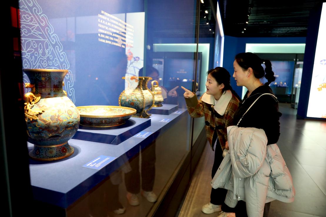 2月20日,游客在四川省广安市博物馆参观“韵古溢彩——故宫博物院藏宫廷珐琅器精品展”,博物馆里过春节。